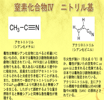 窒素を含む主な原子団は、茶色で書いたイソシアネート基、シアノ基、などのほか、毒性が強いものが多いのです。 近年、大気中の窒素を合成原料にする工業化が進んで、危ない有機化合物が新しく合成され始めました。香料にも、消臭剤にも、医用・介護用品にも使われてきて、危ないことが増えました。