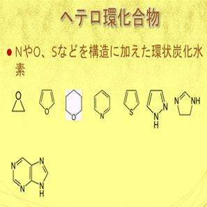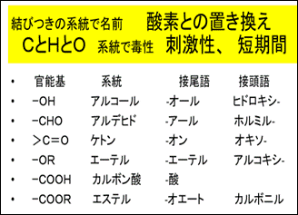ベンゼンの輪同士も幾つも繋げて、いろいろな構造の化合物を作ることができます。鎖状化合物と繋いでも良いのです。 こうして、無限に分子の形を作ることができるので有機化合物は、何千万という沢山の種類がどんどん増やされているのです。 さて、今までは元のメタンを繋げた炭素と水素だけの化合物を見てきました。その基本の上に、水素のあったところに、別種の元素原子が入れ換った化合物があることを理解しましょう。天然の有機化合物には、酸素原子、窒素原子が入れ替わって組み込まれたものが大部分で、リンや硫黄の原子が組み込まれたものも少しあり、まれには金属原子も組み込まれていました。 人工的な有機物が作られるようになってから、海水を分解してとった塩素などハロゲン原子を組み込んだ有機化合物がつくられ、盛んに使われ、これは毒性が強い上にいつまでも消えないので問題になりました。有機化合物では特定の少数原子の集まりが、あたかも原子であるかのように特定の性質を持った原子団とし、水素のあったところに組み込まれることが多いのです。 酸素を含む原子団としては、アルコールを作るもの、アルデヒドを作るもの、ケトンを作るもの、カルボン酸を作るものなどがあります。