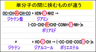 モノマーが同じジイソシアネートでも、分子の中心部分Rはいろいろなものがあります。トルエンだったり、ヘキサンだったり。 間をつなぐ化合物のジアルコールにもいろいろの中心部分R‘が使われます。エチレンだったりフェノールだったり。 それによって、出来上がった高分子が同じポリウレタンと呼ばれていても、分子の繰り返し部分の中に含むRとR‘がトルエンとエタンだったり、ヘキサンとフェノールだったりという具合に。単分子の間には挟む結合剤がジアミンだと尿素ポリマーになります。モノマーがジケテンの時にも、挟むものがジアルコールだとポリエステルが出来、 挟むものがジアミンだと、ポリアミンが出来ます。 一口にポリアミドと言っても、あるいはポリエステルといって、モノマー中心部分のRと、挟む分子のR‘がいろいろの分子の組み合わせものがあるのです。